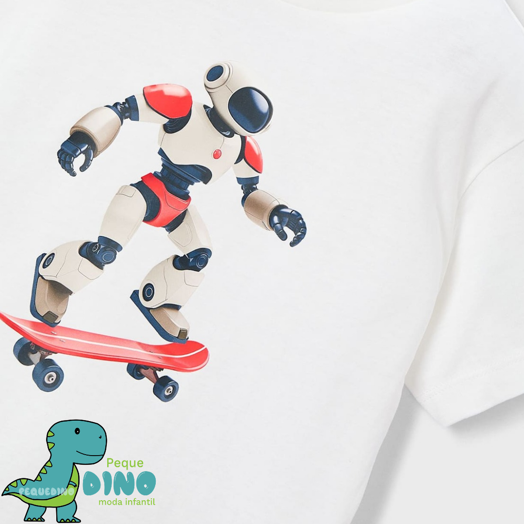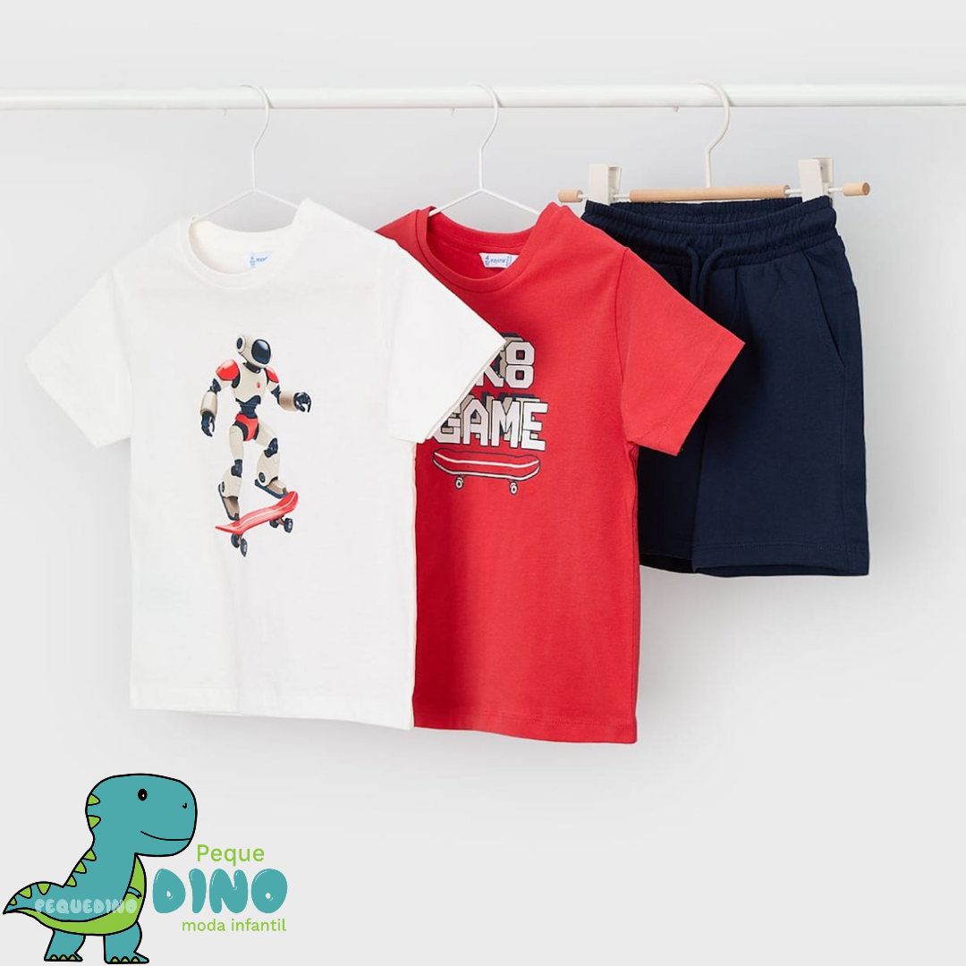 Conjunto 3 piezas: pantalón corto azul marino + camiseta roja con estampado «Skate Game» + camiseta blanca con robot skater.